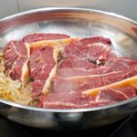 Now slice the beef into thin strips and use a meat hammer to fund out the meat. Cover and place in the fridge.
